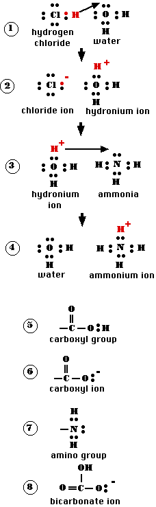 This ionization produces:Now let us bubble ammonia gas (NH3) through the hydrochloric acid. Ammonia molecules have one pair of unshared electrons and these have a greater affinity for a proton than do the unshared electrons in the water molecule. Consequently, the proton shifts again ("3") to form a new ion, the ammonium ion (NH4+) and water ("4").