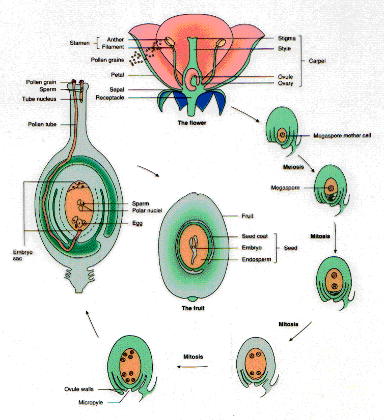 - dispersal of the species to new locations (aided in angiosperms by the fruit)