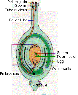 The pollen tube enters the ovule through the micropyle and ruptures. - One sperm nucleus fuses with the egg forming the diploid zygote.
