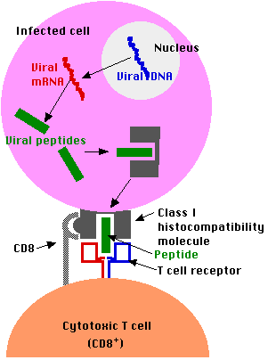 - CD8 molecules that bind the CD8 receptor (shown above as a gray hemisphere) on the histocompatibility molecule.