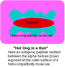 - a receptor (TCR) able to bind the peptide and flanking portions of the histocompatibility molecule (the hot dog in the bun) and