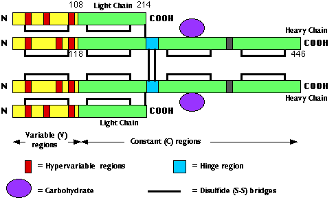 This image represents the polypeptide chain structure of a molecule of IgG. The numbers indicate the number of amino acids (counting from the amino terminal ("N"). In the actual molecule, the chains are folded to that each cysteine is brought close to the partner with which it forms a disulfide (S-S) bridge.