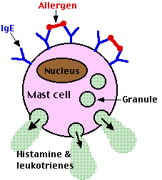 An attack of asthma begins when an allergen is inhaled. The allergen binds to IgE antibodies - those that have binding sites for the allergen - on mast cells in the lungs. Binding triggers exocytosis of the mast cells with the release of