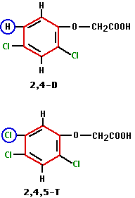 As the formulas show, 2,4,5-T is 2,4-D with a third chlorine atom, instead of a hydrogen atom, at the #5 position in the benzene ring (blue circles).