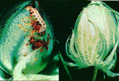 On the left is a cotton boll being attacked by a cotton bollworm. The cotton plant that produced the boll on the right contains and expresses the gene for the Bt toxin. The gene was introduced into the plant by genetic engineering. (Image courtesy of the Monsanto Corp.)