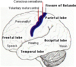 A similar region is located in a parallel band of cortex just behind the fissure of Rolando. This region is concerned with sensation from the various parts of the body. When spots in this sensory area are stimulated, the patient reports sensations in a specific area of the body. A map can be made based on these reports.