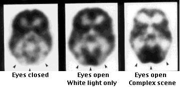 These images (courtesy of Michael E. Phelps from Science 211:445, 1981) were produced in a PET scanner. The dark areas are regions of high metabolic activity. Note how the metabolism of the occipital lobes (arrows) increases when visual stimuli are received.