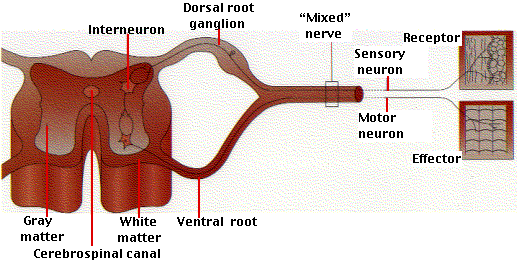 The interneurons carrying impulses to and from specific receptors and effectors are grouped together in spinal tracts.