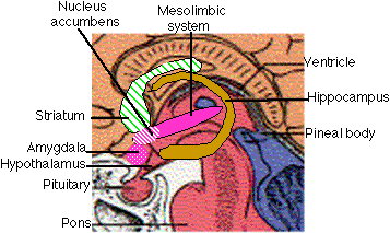 - the ventral tegmental area (VTA): packed with dopamine-releasing neurons that synapse deep within the forebrain. The VTA seems to be involved in pleasure; amphetamines and cocaine bind to the same receptors that it activates and this may account - at least in part - for their addictive qualities.
