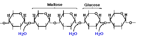 Before starches can enter (or leave) cells, they must be digested. The hydrolysis of starch is done by amylases. With the aid of an amylase (such as pancreatic amylase), water molecules enter at the 1 -> 4 linkages, breaking the chain and eventually producing a mixture of glucose and maltose. A different amylase is needed to break the 1 -> 6 bonds of amylopectin.