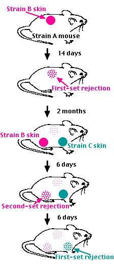 Graft rejection is a form of cell-mediated immunity. If a piece of skin from a mouse of one strain (B) is grafted onto the flank of a mouse of a second strain (A), the graft does well at first. Blood vessels from the host grow into it, and it functions normally. After some 10-14 days, however, the blood supply to the graft breaks down and the graft degenerates. Finally it is sloughed off like an old scab. This is called a first-set rejection.