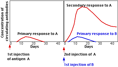 The graphs demonstrate the main features of the secondary antibody response. A second injection of antigen A produces a secondary response. But the response is specific, not simply the result of a general enhancement of the immune system, because the simultaneous injection of a new antigen (B) produces only a primary response to it.