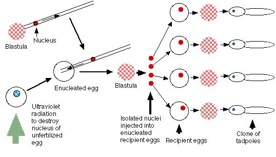 Furthermore, when a transplanted nucleus has programmed the formation of a new blastula, the cells of the new blastula can then serve as the source of identical nuclei to use to form a clone of genetically-identical tadpoles.