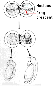 Back in the 20s, the German experimental embryologist Hans Spemann showed that even after 5 divisions of the fertilized egg, the nuclei retained the potential to program the complete development of an adult. Using strands of baby hair, he tied loops around fertilized amphibian (newt) eggs so that they were constricted into two halves with