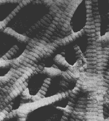 When the triple helix is secreted from the cell (usually by a fibroblast), the globular ends are cleaved off. The resulting linear, insoluble molecules assemble into collagen fibers. They assemble in a staggered pattern that gives rise to the striations seen in this electron micrograph (courtesy of Dr. Jerome Gross). (Type IV collagens are an exception; they form a meshwork rather than striated fibers.)