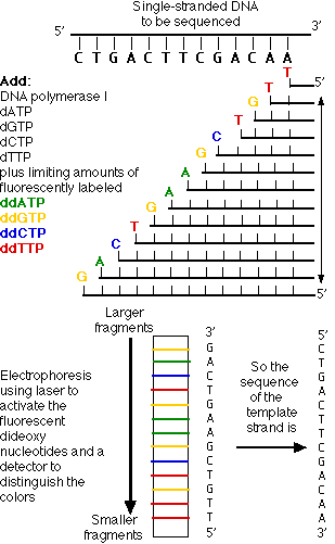 At the end of the incubation period, the fragments are separated by length from longest to shortest. The resolution is so good that a difference of one nucleotide is enough to separate that strand from the next shorter and next longer strand. Each of the four dideoxynucleotides fluoresces a different color when illuminated by a laser beam and an automatic scanner provides a printout of the sequence.| If you wish to see a representative example of a DNA sequence (455 nucleotides of the lysU gene of E. coli) which was generated by an automated sequencing device, LINK HERE. (The file size is 172K.) (The image is courtesy of Pharmacia Biotech Inc., Piscataway, NJ.) |