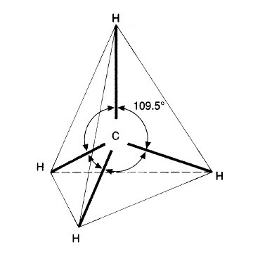 In three-dimensional (3D) space, the four covalent bonds of carbon atoms point toward the corners of a regular tetrahedron. The molecule represented to the right is methane (CH4).