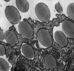 This electron micrograph (courtesy of Dr. Robert J. North) shows a guinea phagocyte ingesting polystyrene beads. Several beads are already enclosed in phagosomes while the others are in the process of being engulfed.