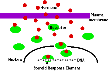 Steroid hormones, being hydrophobic molecules, diffuse freely into all cells. However, their "target" cells contain cytoplasmic and/or nuclear proteins that serve as receptors of the hormone. The hormone binds to the receptor and the complex binds to hormone response elements - stretches of DNA within the promoters of genes responsive to the hormone. The hormone/receptor complex acts as a transcription factor turning target genes "on" (or "off").