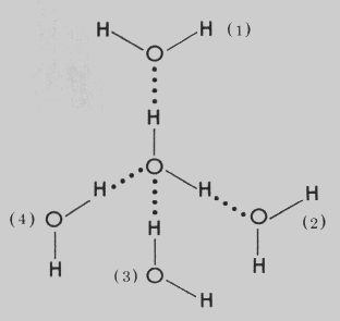 Thus when water molecules are close together, their positive and negative regions are attracted to the oppositely-charged regions of nearby molecules. The force of attraction, shown here as a dotted line, is called a hydrogen bond. Each water molecule is hydrogen bonded to four others.