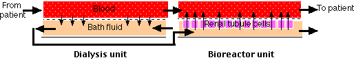 In an attempt to solve these problems, a research team at the University of Michigan is experimenting with adding a "Bioreactor unit" to the dialysis unit. The bioreactor consists of many hollow, porous tubes on the inner wall of which is attached a monolayer of proximal tubule cells (derived from pigs). The dialysis bath fluid passes through the lumen of the tubes where molecules and ions can be picked up by the apical surface of the cells. Discharge of essential molecules and ions (as well as hormones) at the basolateral surface of the cells places these materials back in the blood (just as the proximal tubule cells in the nephron normally do). So far, all the testing has been done using dogs, but the results seem promising.