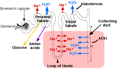 In the distal tubules, more sodium is reclaimed by active transport. The amount is closely regulated, chiefly by the action of the hormone aldosterone. Water follows by osmosis.