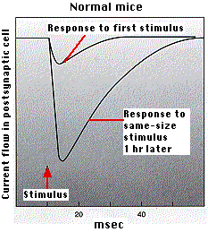 What is remarkable about this system is that over time these synapses become increasingly sensitive so that a constant level of presynaptic stimulation becomes converted into a larger postsynaptic output (graph on right). This phenomenon, which can last for weeks, is called long-term potentiation (LTP).