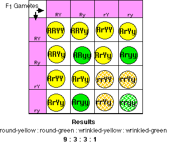 According to Mendel's second rule, the genes determining color of the endosperm should be inherited independently of the genes determining texture. The F1 should thus produce gametes in approximately equal numbers.