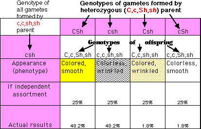 When the pollen of the first strain is dusted on the silks of the second (or vice versa), the kernels produced (F1) are all yellow and smooth. So the alleles for yellow color (C) and smoothness (Sh) are dominant over those for colorlessness (c) and shrunken endosperm (sh).