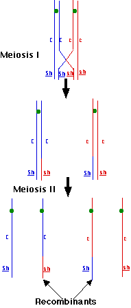 During prophase I of meiosis, pairs of duplicated homologous chromosomes unite in synapsis and then nonsister chromatids exchange segments during crossing over. It is crossing over that produces the recombinant gametes. In this case, whenever a crossover occurs between the locus for kernel color and that for kernel texture, the original combination of alleles (CSh and csh) is broken up and a chromosome containing Csh and one containing cSh will be produced.
