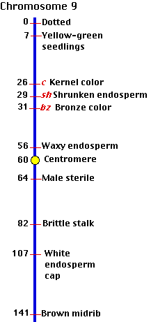 Chromosome maps prepared by counting phenotypes are called genetic maps. They have been prepared for many eukaryotes, including corn, Drosophila, the mouse, and the tomato. A genetic map of chromosome 9 (the one that carries the C, Sh, and bz loci) of the corn plant (Zea mays) is shown on the right.