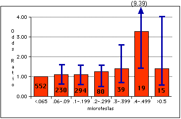 Only one class of exposure (0.400 - 0.499 µT) showed a statistically significant difference between patients and controls. Is it truly significant? Perhaps. But note that only 19 children of the 1,239 enrolled in the study lived in homes with this level of magnetic field.
