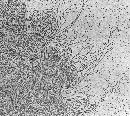 This image (provided by J. R. Paulson and U. C. Laemmli) provides a graphic illustration of the problem. It shows a bit (no more than 3%) of the single molecule of DNA released from a single human chromosome. (The chromosome was treated to remove its histones). Remembering that this is 3% of the DNA of only one of the 46 chromosomes in the human diploid cell, you can appreciate the problem faced by the cell of how to separate without error these great lengths of DNA without creating horrible tangles.