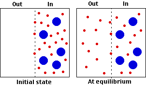 Cellophane is perforated with tiny pores that permit ions and small molecules to pass through but exclude molecules with molecular weights greater than about 12,000. If we fill a piece of cellophane tubing with a mixture of starch and sugar and place it in pure water, the sugar molecules (red dots) will diffuse out into the water until equilibrium is reached; that is, until their concentration is equal on both sides of the membrane. Because of their large size, all the starch (blue disks) will be retained within the tubing.