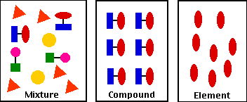 Compounds are homogeneous forms of matter. Their constituent elements (atoms and/or ions) are always present in fixed proportions (1:1 depicted here).