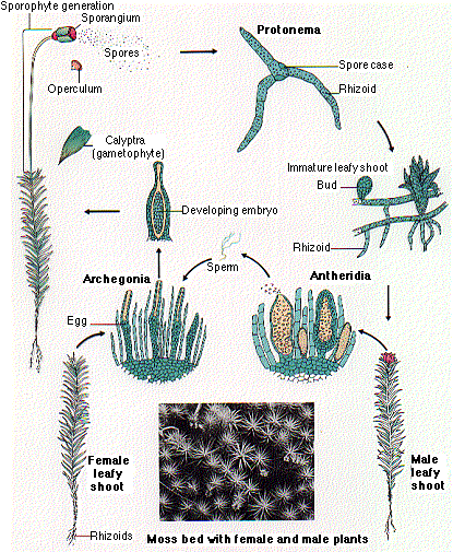 In early spring, raindrops splash sperm from male to female plants. These swim down the canal in the archegonium to the chamber containing the egg. The resulting zygote begins the sporophyte generation.