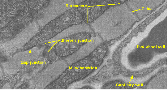 Cardiac or heart muscle resembles skeletal muscle in some ways: it is striated and each cell contains sarcomeres with sliding filaments of actin and myosin.