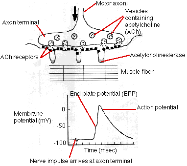 Myasthenia gravis is an autoimmune disorder affecting the neuromuscular junction. Patients have smaller end plate potentials (EPPs) than normal. With repeated stimulation, the EPPs become too small to trigger further action potentials and the fiber ceases to contract. Administration of an inhibitor of acetylcholinesterase temporarily can restore contractility by allowing more ACh to remain at the site.