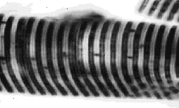 The latent period is followed by contraction. Contraction, like the action potential, is all-or-none. Either the fiber contracts maximally or it doesn't contract at all. The process of contracting takes some 50 msec; relaxation of the fiber takes another 50-100 msec. Because the refractory period is so much shorter than the time needed for contraction and relaxation, the fiber can be maintained in the contracted state so long as it is stimulated frequently enough (e.g., 50 stimuli per second). Such sustained contraction is called tetanus. As we normally use our muscles, the individual fibers go into tetanus for brief periods rather than simply undergoing single twitches.