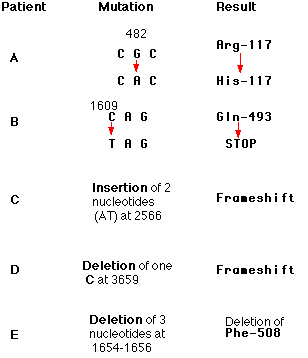 In one patient with cystic fibrosis (Patient B), the substitution of a T for a C at nucleotide 1609 converted a glutamine codon (CAG) to a STOP codon (TAG). The protein produced by this patient had only the first 493 amino acids of the normal chain of 1480 and could not function.