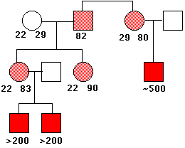 This image shows the pattern of inheritance of the fragile X syndrome in one family. The number of times that the trinucleotide CGG is repeated is given under the symbols. The gene is on the X chromosome, so women (circles) have two copies of it; men (squares) have only one. People with a gene containing 80-90 repeats are normal (light red), but this gene is unstable, and the number of repeats can increase into the hundreds in their offspring. Males who inherit such an enlarged gene suffer from the syndrome (solid red squares). (Data from C. T. Caskey, et al.).