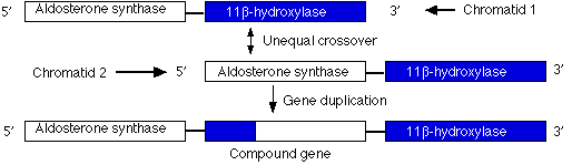 Duplications are a doubling of a section of the genome. During meiosis, crossing over between sister chromatids that are out of alignment can produce one chromatid with an duplicated gene and the other (not shown) having two genes with deletions. In the case shown here, unequal crossing over created a second copy of a gene needed for the synthesis of the steroid hormone aldosterone.