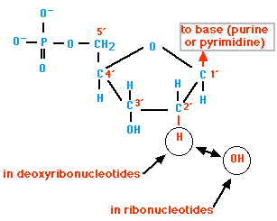 2. A nitrogen-containing ring structure called a base. The base is attached to the 1' carbon atom of the pentose.