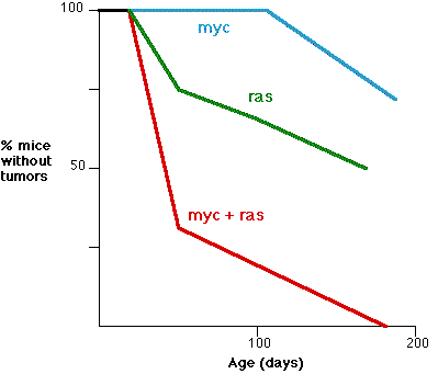This graph (based on the work of E. Sinn et al, Cell 49:465,1987) shows the synergistic effect of two oncogenes. The fraction (%) of transgenic mice without tumors is shown as a function of age. Three groups are shown: