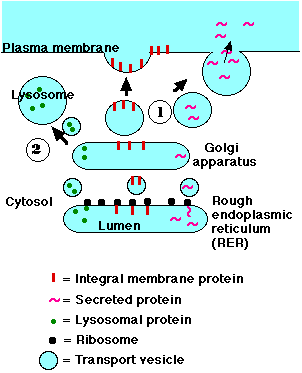 - proteins that do not receive this marker, leave in transport vesicles that eventually fuse with the plasma membrane (path 1 in the figure). These are: