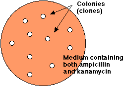 All E. coli cells transformed by the vector, whether it carries human DNA or not, can grow in the presence of ampicillin. But E. coli cells transformed by a plasmid carrying human DNA will be unable to grow in the presence of kanamycin.