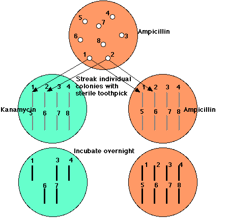 So,All those clones that continue to grow on ampicillin but fail to grow on kanamycin (here, clones 2, 5, and 8) have been transformed with a piece of human DNA.