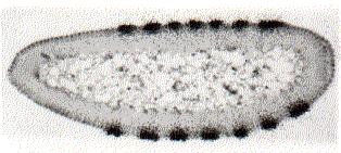This photomicrograph (courtesy of Peter A. Lawrence and Blackwell Scientific Publications, Ltd.) shows 7 bands of this colored product identifying the cells that were expressing the even-skipped gene. This event was "reported" by the lacZ gene. The 7 dark stripes reveal regions that alternate with the 7 bands formed by the cells expressing fushi-tarazu (top picture).