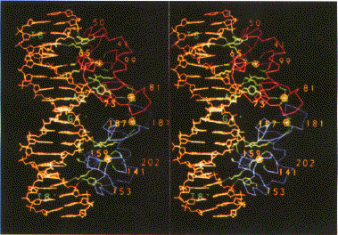 This image (courtesy of P. B. Sigler) shows a stereoscopic view of the glucocorticoid response element (DNA, the double helix shown in yellow at the left of each panel) with the glucocorticoid receptor (a protein homodimer, right portion of each panel) bound to it.