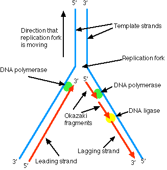 DNA polymerase can only synthesize a new strand of DNA as it moves along the template strand in the 3' -> 5' direction. This works fine for the 3' -> 5' strand of a chromosome as the DNA polymerase can move uninterruptedly from an origin of replication until it meets another bubble of replication or the end of the chromosome. However, synthesis using the 5' -> 3' strand as the template has to be discontinuous. When the replication fork opens sufficiently, DNA polymerase can begin to synthesize a section of complementary strand - called an Okazaki fragment - working in the opposite direction. Later, DNA ligase stitches the Okazaki fragments together.